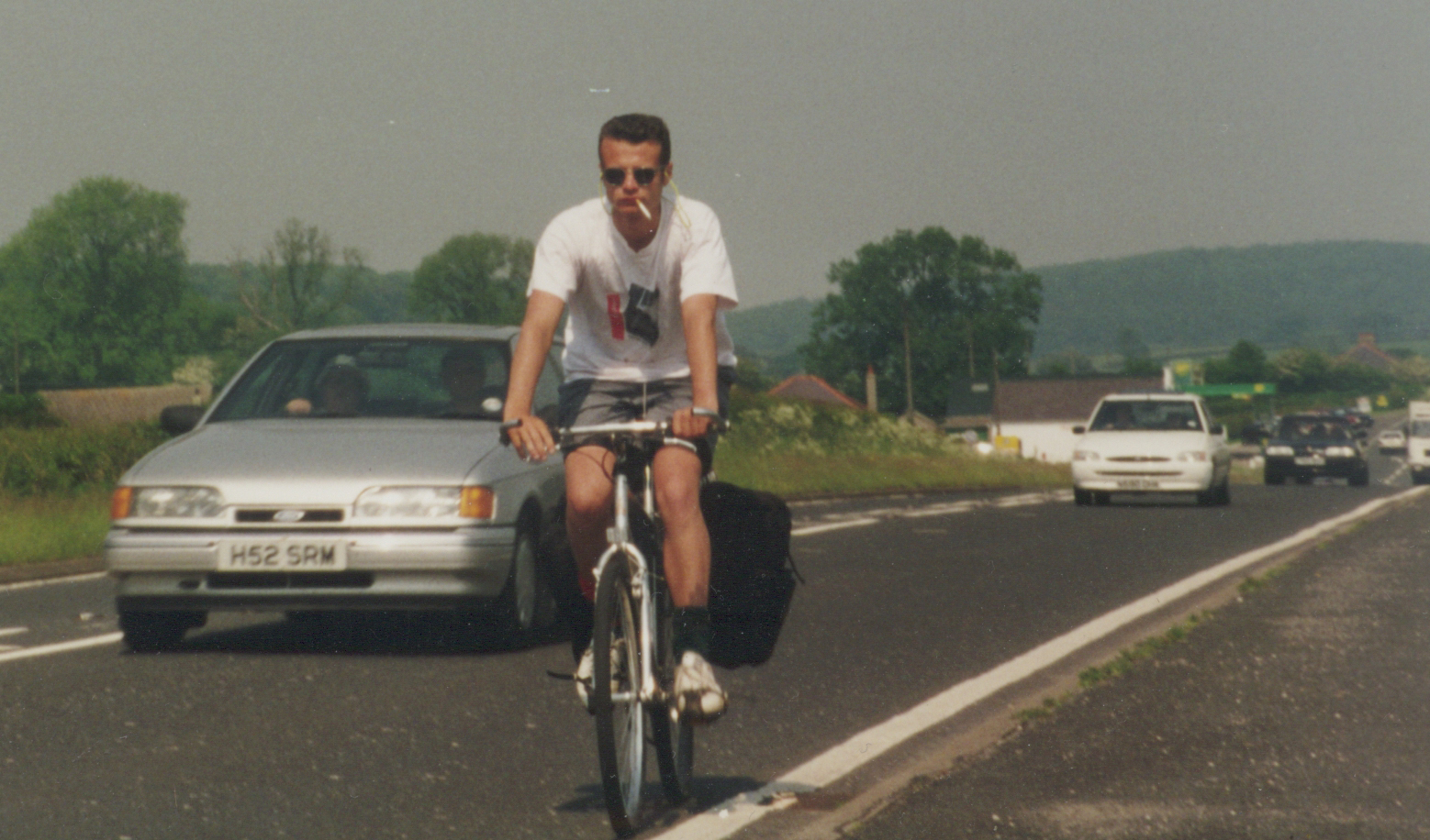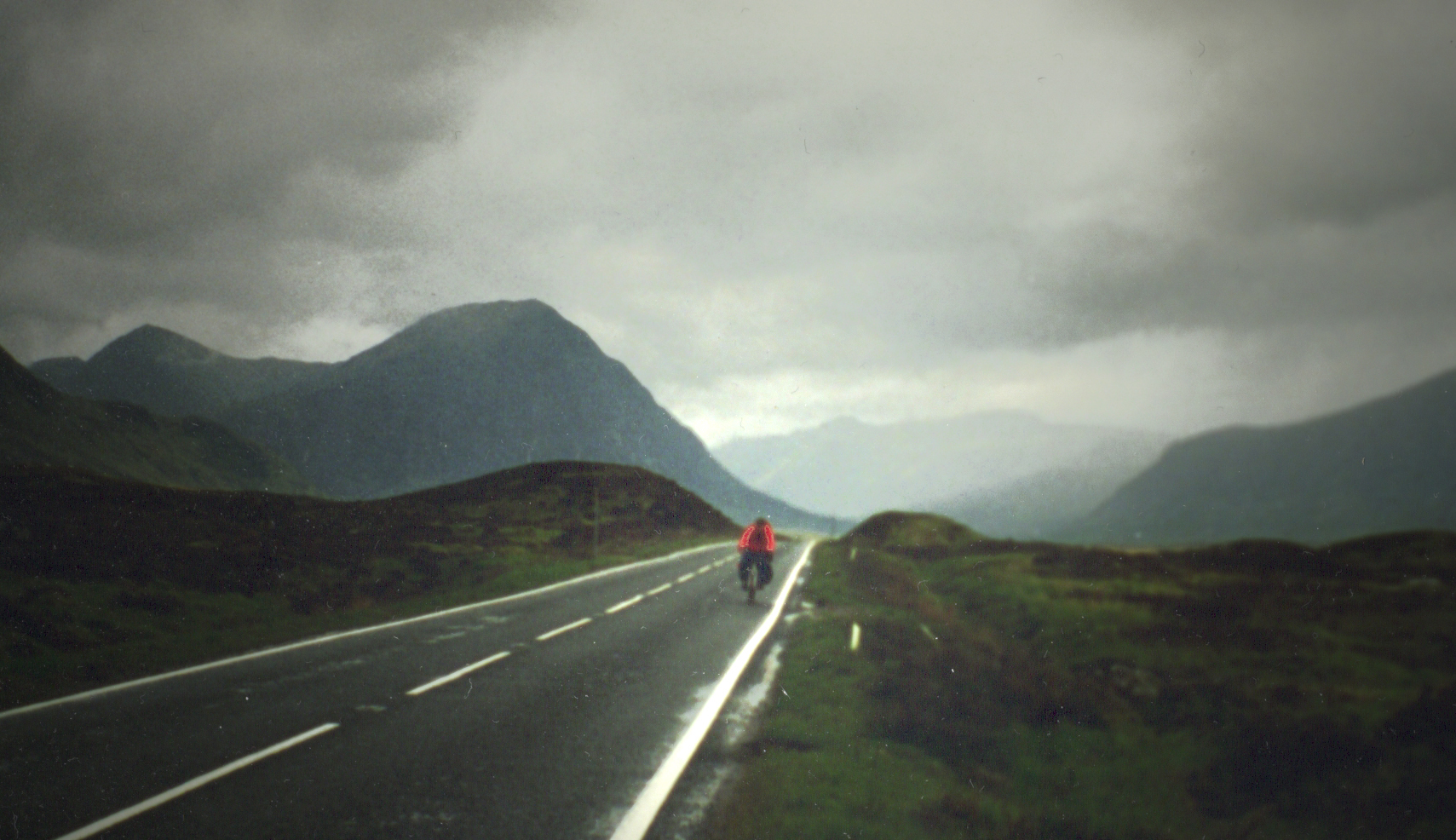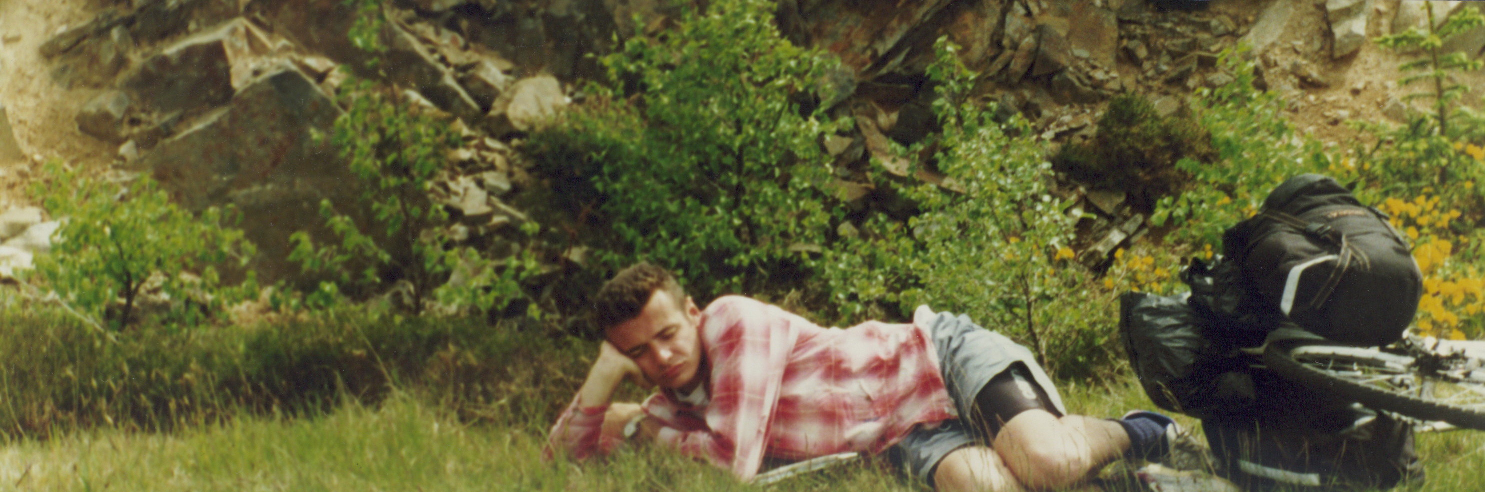 I was lying where I’d collapsed on roadside heather, bicycle still between my legs (below, click all pics for quite high res (scanned photos)). Will was slumped next to me, looking like a hostage who’s given up hope, then run a marathon. We were 40 miles into the 1,000 between John O’Groats and Land’s End, with 15 more hilly Highland miles to go that day. “Maybe,” panted Will, “maybe we should have done some training.”